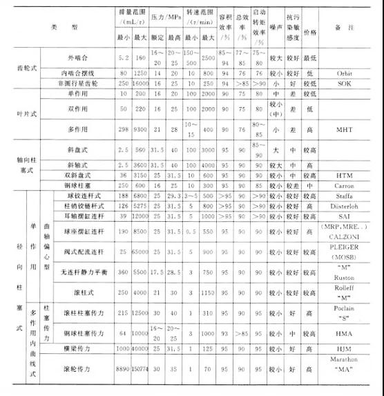 ①液压马达的种类较多,特性不同,应针对具体用途及其工况,参照下表选择合适的液压马达。