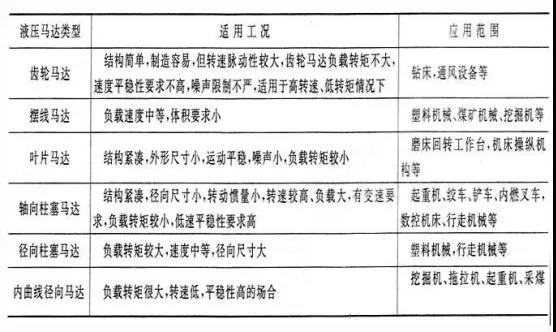 3、各类液压马达的适用工况和应用范围如下表所示: