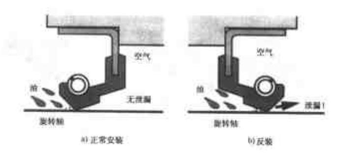 当正向安装时,满足密封侧坡度较陡,泵送作用可以实现密封;反向安装不满足,静止式不泄露,运转时泄漏。