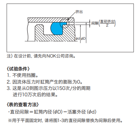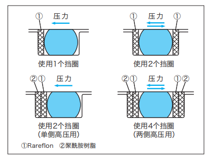 从图1-3来看,压力或间隙也超出极限时,请使用挡圈。从两个方向施加压力时,将挡圈安装于O形圈的两侧,从一个向施加压力时,安装于施加压力的相反侧。