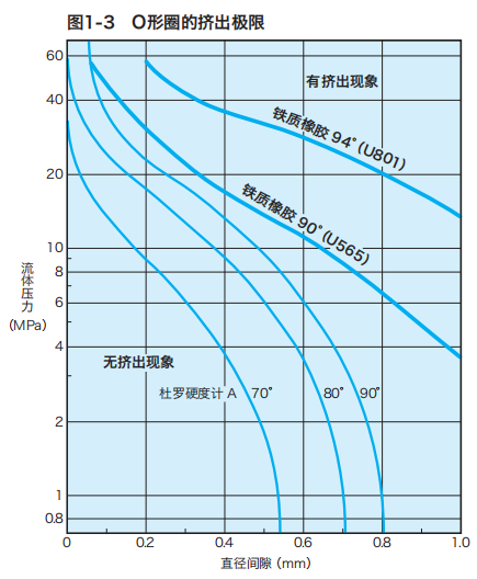 挤出由流体的压力和间隙及橡胶的硬度决定。其关系如图1-3所示,请参考。(该值的前提是没有因压产生的沟槽变形的情况。若担心受压力使密封面发生变形,则请将间隙的值设计为75%左右。)