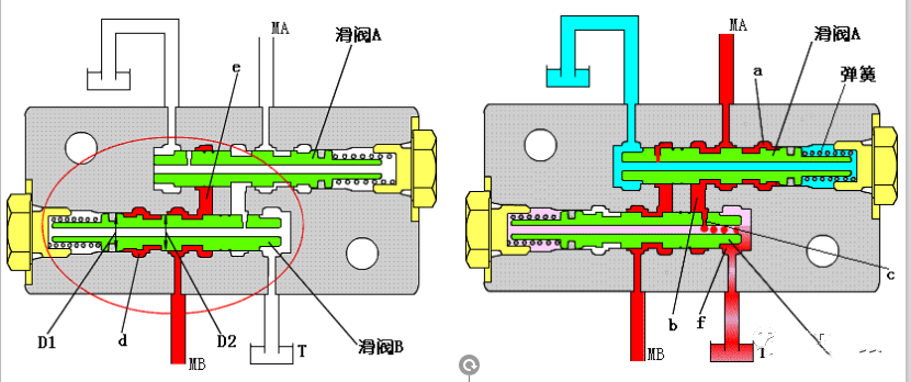 停止回转时,油口MB产生闭合压力,压力油进入油腔d,滑阀B按照D1>D2的面积差克服弹簧力向左移动,MB压力进入油腔e,压力油被滑阀A关闭,因此产生液压制动;