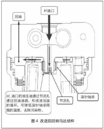 我们在回转马达滚针轴承上新增加补油口,并通过单向阀与液压油箱连接,单向阀开启压力即为补油口背压,一般为0.5MPa。补油口是为回转马达停止时释放压力与消除气穴设置的油口,可为回转马达补充液压油及释放压力。为了改进滚针轴承润滑不良的状况,我们在回转马达壳体上增加了节流孔,形成补油口-节流孔-回油口的油道。改进后回转马达结构如图4所示。