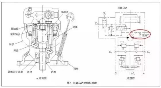 回转马达内有3对运动摩擦副,即柱塞与缸体柱塞孔、缸体与配油盘、滑履与斜盘。回转马达内的压力油经过这3对运动摩擦副的间隙泄漏到缸体与马达壳体之间的空间后,再经马达壳体上的泄油口直接流回液压油箱,即图1b中的泄油口Dr口。