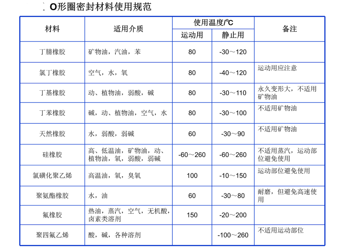 一般来说耐油用丁睛橡胶,耐天候和臭氧用氯丁橡胶,耐热用丙烯酸酷橡胶或氟橡胶,耐高压、耐磨用聚氨酷橡胶,耐寒同时又耐油用共聚氯醇橡胶等各种胶料的适用范围详见下表。