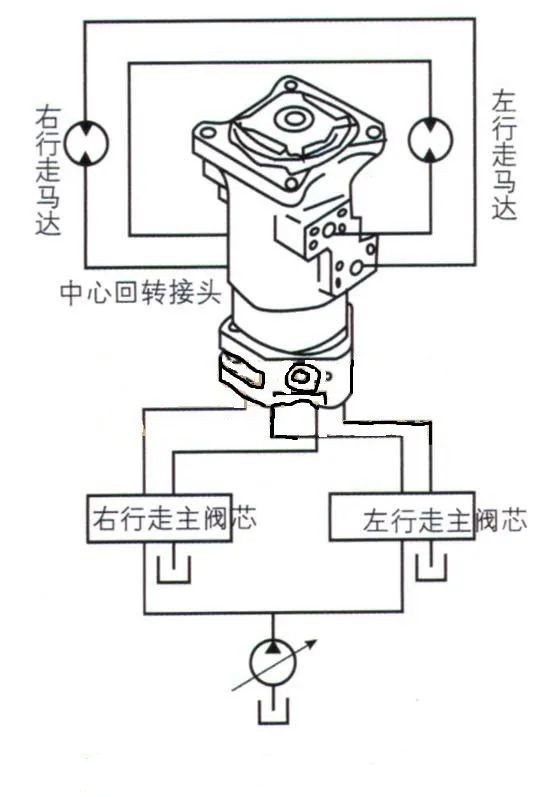 中央回转接头连接挖掘机上、下机体油路,其由壳体和芯轴2部分组成。芯轴安装在下部机体上,壳体安装在上部机体上,芯轴上开有环形油槽和垂直油孔,垂直油孔与油管相连。压力油经行走主阀阀芯、中央回转接头壳体的油口、芯轴上的环形油槽和垂直油孔输送到行走马达。中央回转接头壳体随上部机体回转时,壳体上的油口可与芯轴上的油槽保持畅通。中央回转接头工作原理如下图所示。