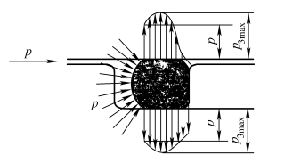 由于预密封作用,O形圈与被密封光滑面和沟槽底面紧密接触,这样当流体通过间隙进入沟槽时,只能对O形圈的一侧面起作用。在工作状态下,流体通过间隙加到O形圈一侧的内压力进一步加大时,把O形圈推向沟槽另一侧面而挤压变形成D形状态,并把这种压力传递到密封接触表面。因此,由于最初的过盈压力作用,密封压力实际上大于所施加的流体压力。O形圈工作状态下接触面的压力分布如图3所示。