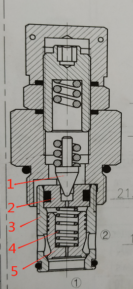 1、顶针 2、阀座 3、阀套 4、弹簧 5、阀芯