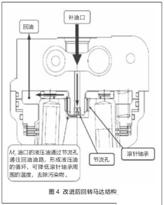 我们在回转马达滚针轴承上新增加补油口,并通过单向阀与液压油箱连接,单向阀开启压力即为补油口背压,一般为0.5MPa。补油口是为回转马达停止时释放压力与消除气穴设置的油口,可为回转马达补充液压油及释放压力。为了改进滚针轴承润滑不良的状况,我们在回转马达壳体上增加了节流孔,形成补油口-节流孔-回油口的油道。由于补油口具有一定的背压,因此补油口的液压油可通过节流孔通往回油油路,形成液压油流经滚针轴承的循环,由此对滚针轴承进行润滑、降温、去除污染物,增强其润滑后,可减少其疲劳磨损、提高其使用寿命。改进后回转马达结构如图4所示。