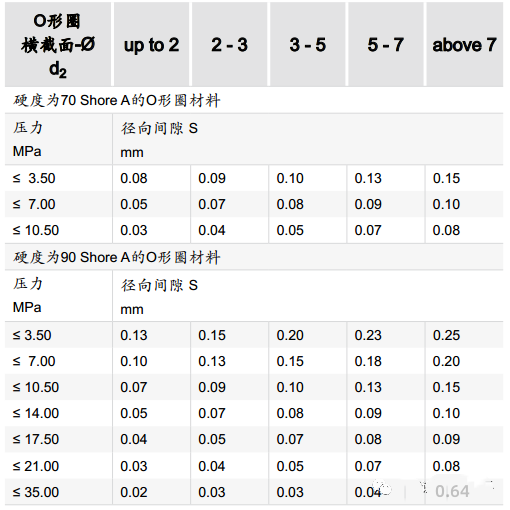 针对径向密封的动态密封工况,下表列出 了可允许间隙的建议,表中数据来源于特瑞堡密封。它是一个关于O型圈横截面和shore硬度的函 数,适用于除了聚氨酯和FEP/PFA包覆的O形圈之外的所有弹性密封材料。 对于压力超过5 MPa且内径大于50 mm的O形圈或者压力超过10MPa且内径小于50 mm的O形圈 ,我们推荐使用挡 圈。