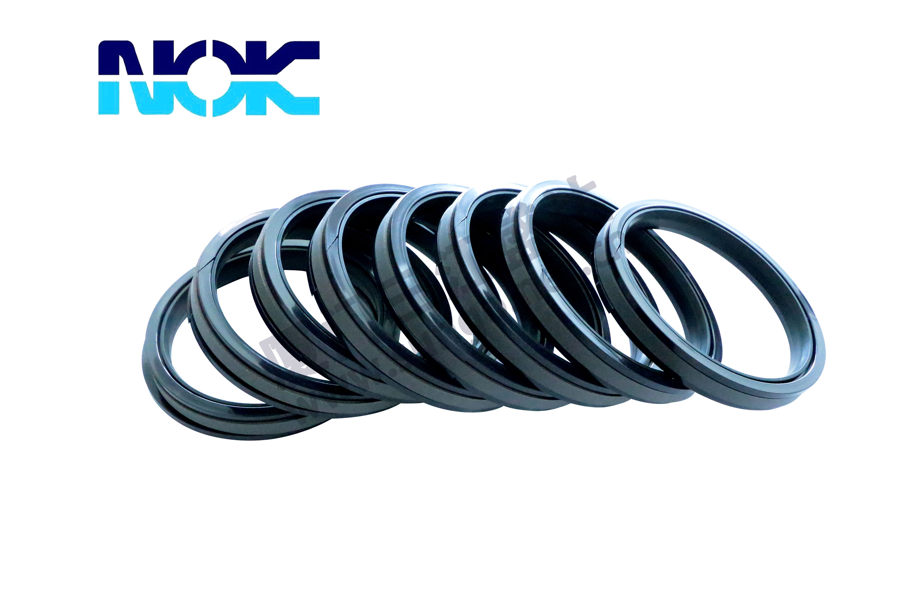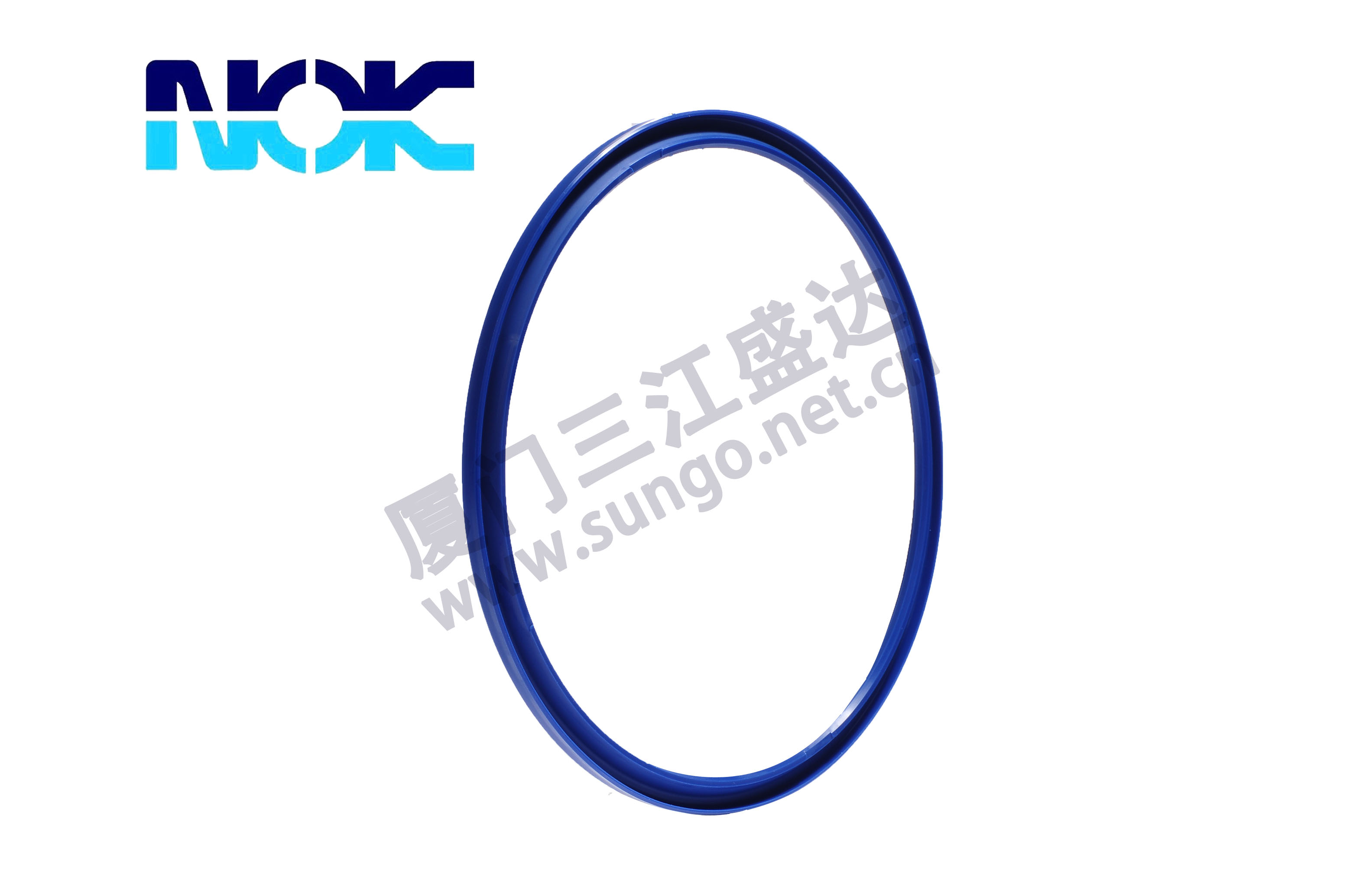 NOK密封滑环材料是用性能极为好的复合材料,作为液压密封件,其承压能力高达50Mpa,瞬时承压可达100MPa,对于活塞由于换向和进人缓冲区域所承受的高压冲击完全可以承受;NOK密封件的设计,针对挖掘机维修市场普遍的密封件使用寿命短的现象,适当了增加了过盈量,提高了密封效果,延长使用寿命,并且NOK有着独特的泄压油槽的功能的设计,缓冲减压更好,背压更舒服,搭配NOK的HBY缓冲环,DKBI的防尘效果更佳。这两者设计,更好的缓解活塞杆的压力。