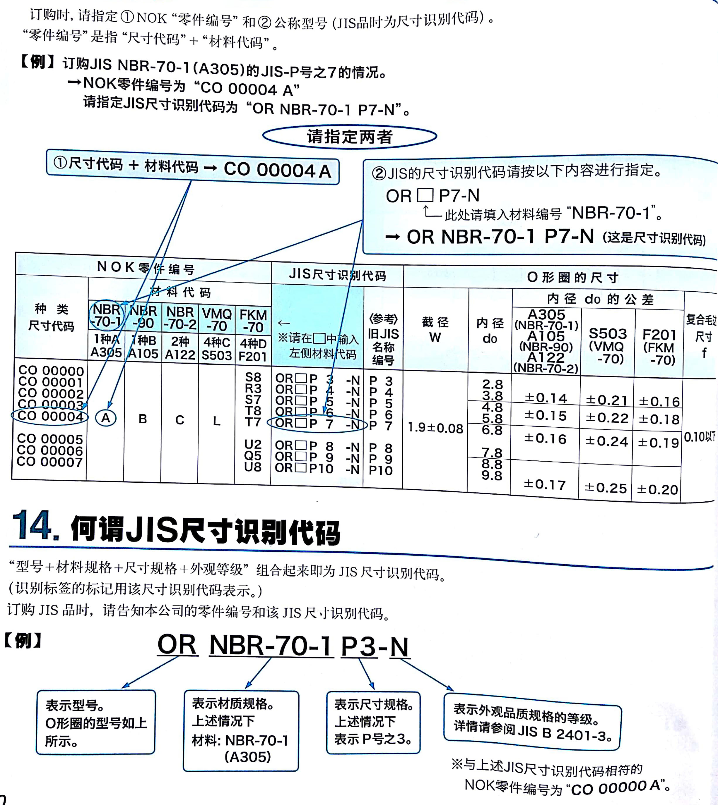 提NOK O型圈的零件编号和JIS品时的尺寸识别代码。