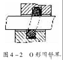 2) 回转密封时O形圈可斜置。O形圈用于回转密封时, 线速度不能太大, 一般以O.3~0.5m/s为宜, 否则会漏油。因为o形圈用于旋转密封时, 在接触处产生摩擦热, 温度 不断上升, 在接触处出现断油现象造成磨损和老化。且处于拉伸状态的橡胶遇热产生收 缩现象 (焦耳效应) 。即产生 “摩擦热 , 收缩 , 箍紧力增大 , 产生摩擦力 , ⋯⋯” 反复循 环, 大大加剧了橡胶老化龟裂和磨损, 导致密封失效, 产生泄漏量与转速有关, 为此, 一般 将O 形圈内径设计成与转轴直径相等或稍大一些 (3~5%) 。在安装时使 ( 形圈从外 向里压缩, 并将断面的压缩量也设计得小一些 (约5%) 。此外, 尽量使用耐热的材料, 并 考虑 O形圈的散热和润滑。另外可斜置安装O形圈 (图4-2) 。采用这些措施后, 可达 到pu值 (密封压力 6 线速度) 为5.6MPa*7.65m/s=42.84MPa.m/s的值。