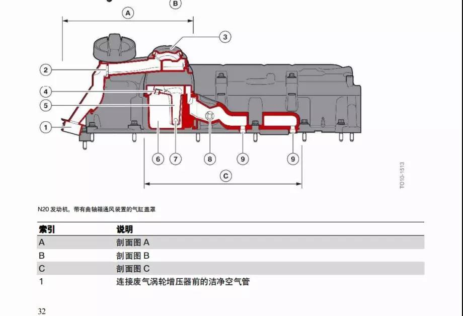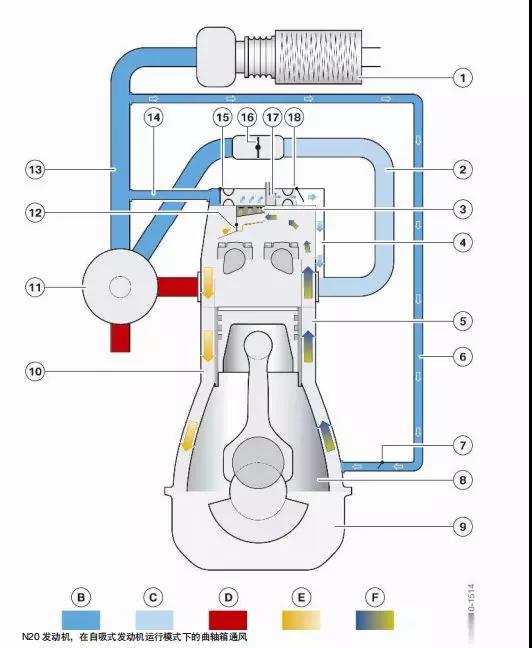 这是N20发动机的曲轴箱强制通风系统的工作路径和原理。