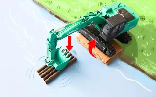 单侧陷落时:请在挖斗底部铺设铺垫物抵住地面,抬升陷落侧的履带板,在履带板下面铺设原木或者木料,使机器脱离泥泞。