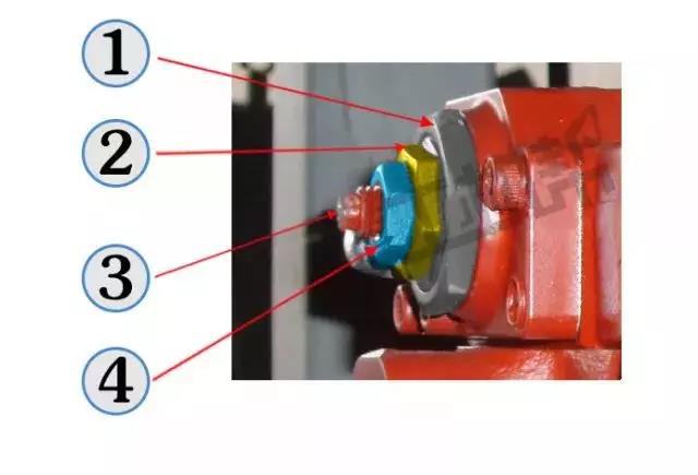 调整步骤:①用开口扳手松开4(蓝色);② 用开口扳手向里(憋车时向外)微调3(红色,每次按15度左右)调节至正常;③拧紧锁紧螺母4(蓝色)。