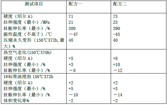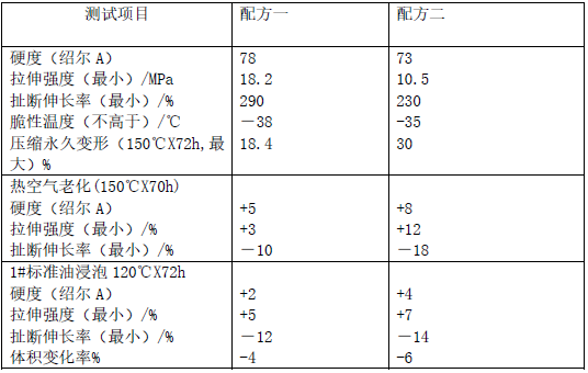 配方二: :氢化丁腈 100;氧化锌 5;氧化镁 10;硬脂酸 1;DCP 4;DM 1.5;TAIC 2.5;防老剂ODA 1.5;石蜡 1;N330 50。