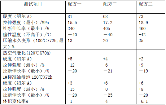 配方三: 丁腈220S 100;氧化锌 5;硬脂酸 1;防老剂OCD 2;N550 40;N774 35;DOP 10;硫磺 0.5;TMTD 2;MD 1。