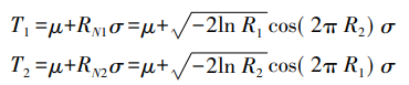 相对应的正态分布N(μ,σ)上的随机数T1、T2为: