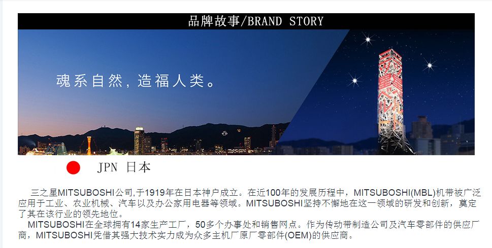 1919年,在日本神户,三之星作为工业皮带的专业制造商正式成立。百年的风雨兼程,虽历尽沧桑,但仍充满朝气;百年的斗转星移,虽千变万化,但仍初心不改。 百年前的破壳 让三之星从无到有 百年间的创造 让三之星如日中天 沾百年之福,成无忧生产 在100年的发展历程中,MITSUBOSHI坚持不懈地在这一领域的研发和创新,奠定了其在该行业的领先地位。为适应未来世界的需求,更加积极向更高技术挑战,为满足人们的生活、丰富社会提供新产品。 三星皮带为满足各种苛刻的汽车开动条件而设计开发的高品质传动带,具有寿命长,无需维修的特点。利用新生产工艺,在一定程度上能够很好的减少噪音,增强耐磨性,提高耐久性。并能减轻车辆承受的负荷,以此达到省油的效果。 三之星皮带产品多样,可用范围广,产品包含:一般产业用机带、办公家用电器用机带、农业机械用机带、汽车用机带,广泛应用于工业、农业机械、汽车以及办公家用电器等领域,质量有保证,使用更安心,让用户无后顾之忧。