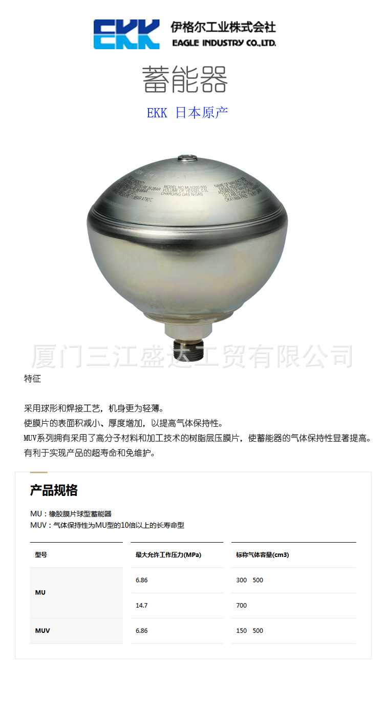 小容量球型轻量隔膜式蓄能器MU,MUV